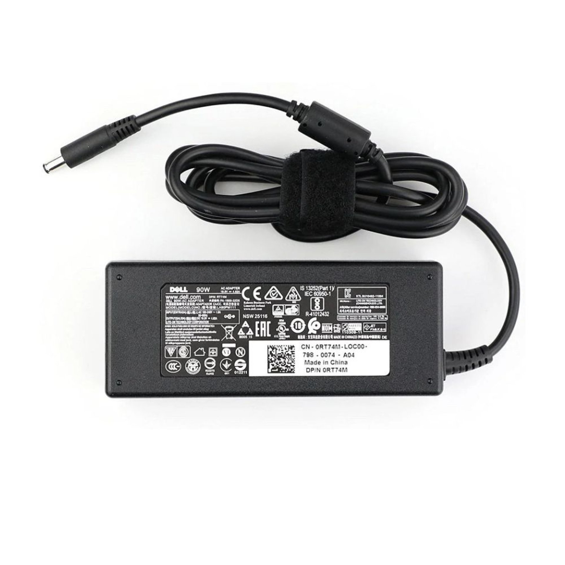 The charger uses the standard 4.5mm × 3.0mm barrel connector with centre pin, commonly found in Dell Inspiron, Vostro, and Latitude 90W systems.