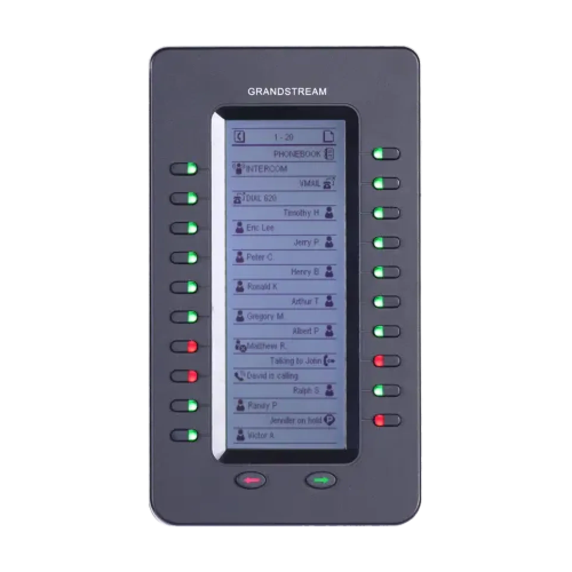 Grandstream GXP2200EXT includes dual-page navigation for 40 keys per module.